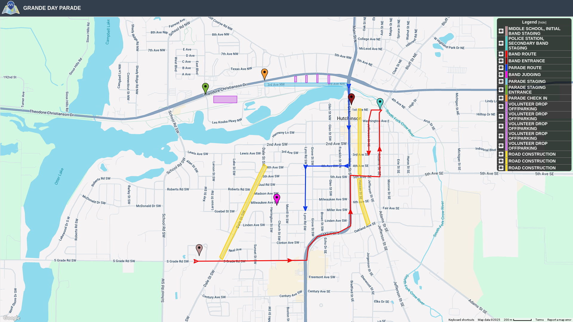 Parade units should enter for staging on the frontage road off of Hwy 7 by Cenex (1110 Hwy 7, Hutchinson MN 55350) and continue East to check in with a Water Carnival Representative.